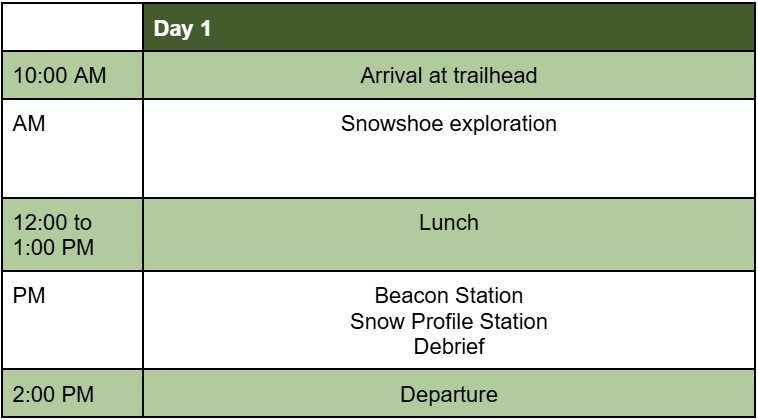 Your program fee includes snowshoes, all avalanche equipment, all equipment for games/ COA educational sessions, and COA guides with a maximum ratio of 1:14. Guides will carry a first aid kit, 2-way radios, bear spray, In Reach communication device, maps of the area, and guide tarps.