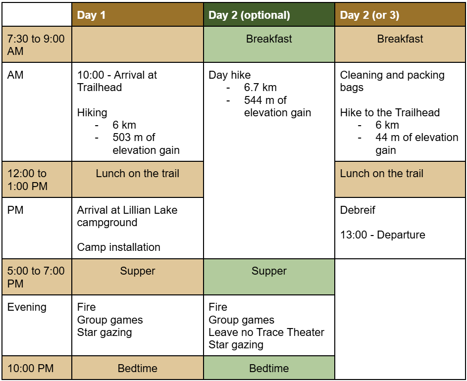 Groups are responsible for personal gear and all meals.