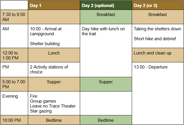 Centered around the theme of wilderness survival skills, the Wildland Overnight is the perfect way to cover the basics and get comfortable in the outdoors. The students will build their own shelters to sleep in out of natural materials found around the campsite. They will also develop essential outdoor skills under the guidance of our experienced guides.